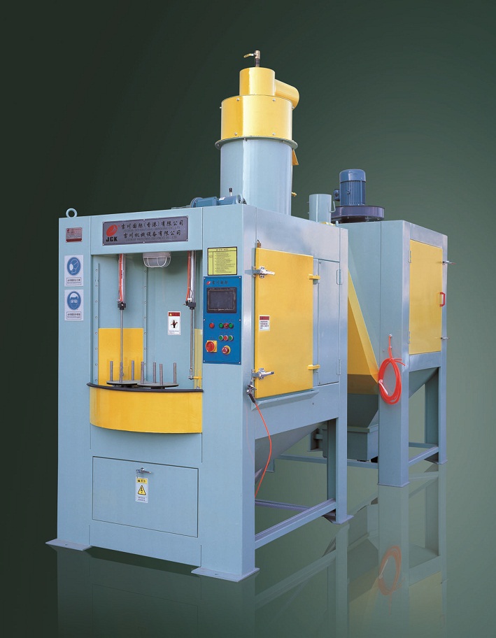 本設(shè)備是根據(jù)我公司針對(duì)轉(zhuǎn)動(dòng)軸和處理要求而專門設(shè)計(jì)的轉(zhuǎn)盤式自動(dòng)噴砂機(jī),完全適合貴公司所提供的產(chǎn)品。根據(jù)貴公司對(duì)產(chǎn)品效率的要求,本機(jī)共大轉(zhuǎn)盤共設(shè)置4個(gè)區(qū)域(90度一個(gè)區(qū)域),每個(gè)區(qū)域設(shè)置2個(gè)工件裝夾工位。大轉(zhuǎn)盤每轉(zhuǎn)動(dòng)90度區(qū)域一停,噴砂區(qū)域內(nèi)共布置12支普壓高速噴砂槍,在噴砂區(qū)1個(gè)區(qū)域 2個(gè)噴砂加工位,各布置6支噴砂槍對(duì)工件需噴砂部位做擺動(dòng)噴砂加工,噴槍可根據(jù)加工需要,隨意調(diào)整其噴射角度,其自動(dòng)化程度較高。 該機(jī)由主機(jī)、旋風(fēng)分離器、除塵箱、抽風(fēng)管道、空氣壓縮系統(tǒng)(客戶自備)、電氣系統(tǒng)等組成。本機(jī)配置12支普壓高速噴砂槍,根據(jù)工件的大小可擺動(dòng)噴砂,也可定點(diǎn)噴砂,靈活方便實(shí)用。